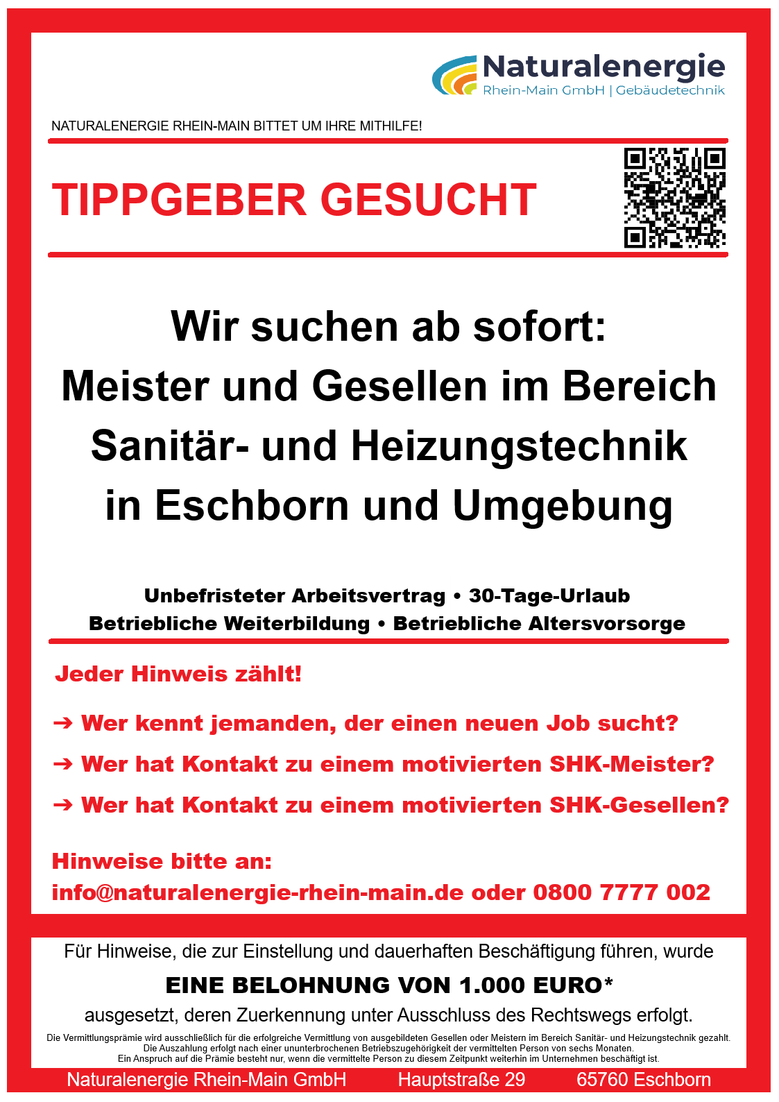 Die Naturalenergie Rhein-Main GmbH mit Sitz in Eschborn ist ein regional verwurzeltes Unternehmen mit über 20 Mitarbeiterinnen und Mitarbeitern – einige davon bringen mehr als 40 Jahre Erfahrung in der Sanitär- und Heizungsbranche mit.